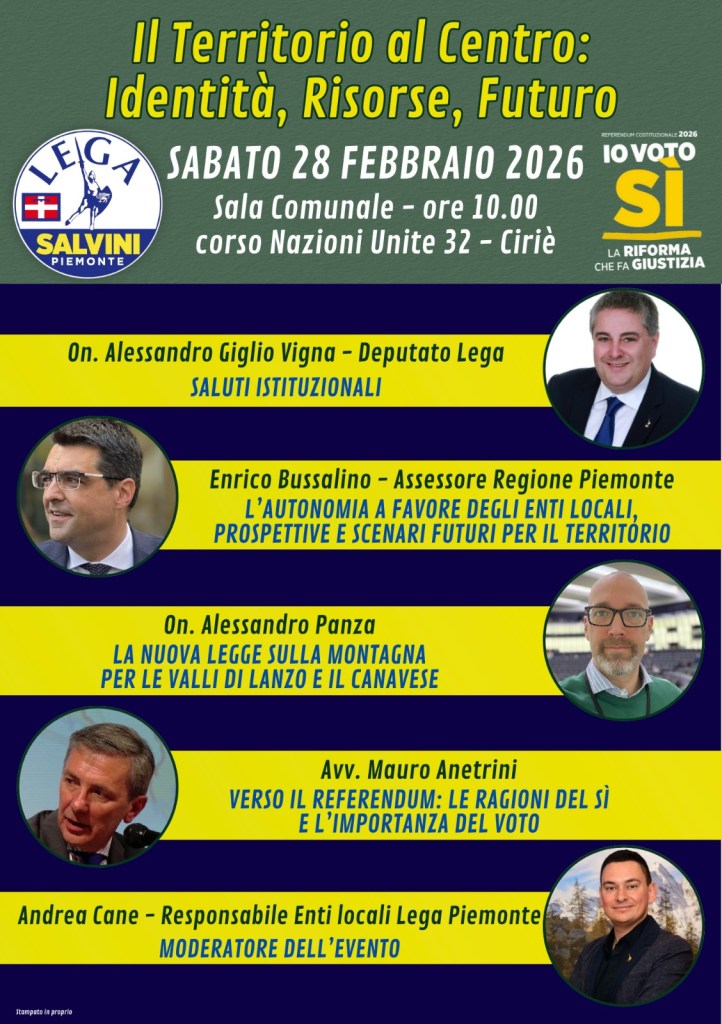 Autonomia, legge sulla montagna e referendum sulla giustizia al centro del dibattito di sabato 28 febbraio 2026, alle ore 10, presso la Sala Comunale di corso Nazioni Unite 32 a Ciriè, dove si terrà l’incontro pubblico dal titolo “Il Territorio al Centro: Identità, Risorse, Futuro”, organizzato dalla Sezione Ciriè e Valli di Lanzo della Lega del Piemonte.