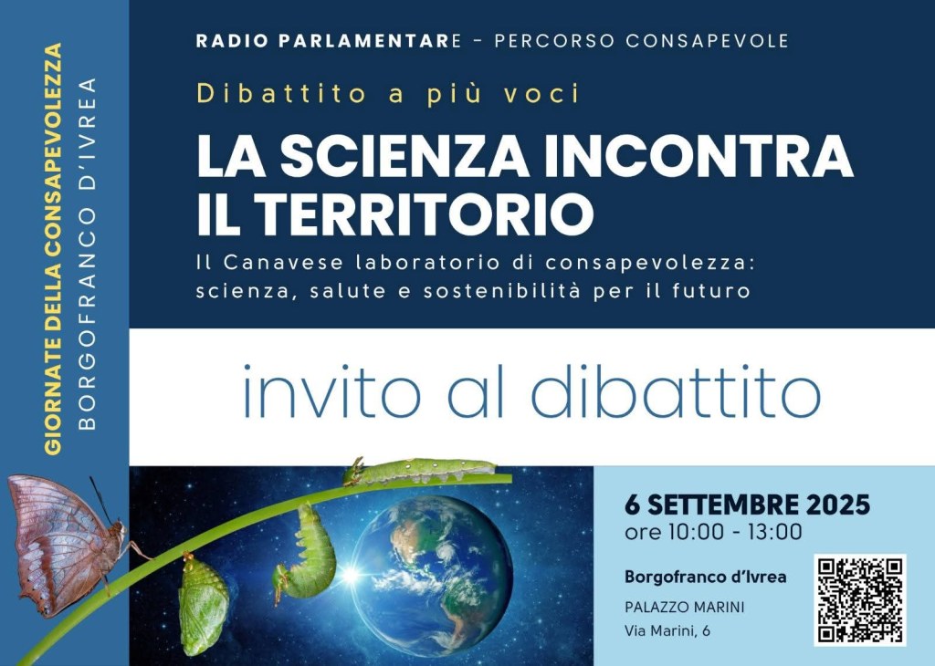 📌 Sabato 6 settembre – ore 10:00-13:00 – Palazzo Marini “La scienza incontra il territorio” Un dialogo aperto tra amministratori locali, cittadini e relatori scientifici, per costruire insieme una visione condivisa dello sviluppo sostenibile e consapevole del Canavese.