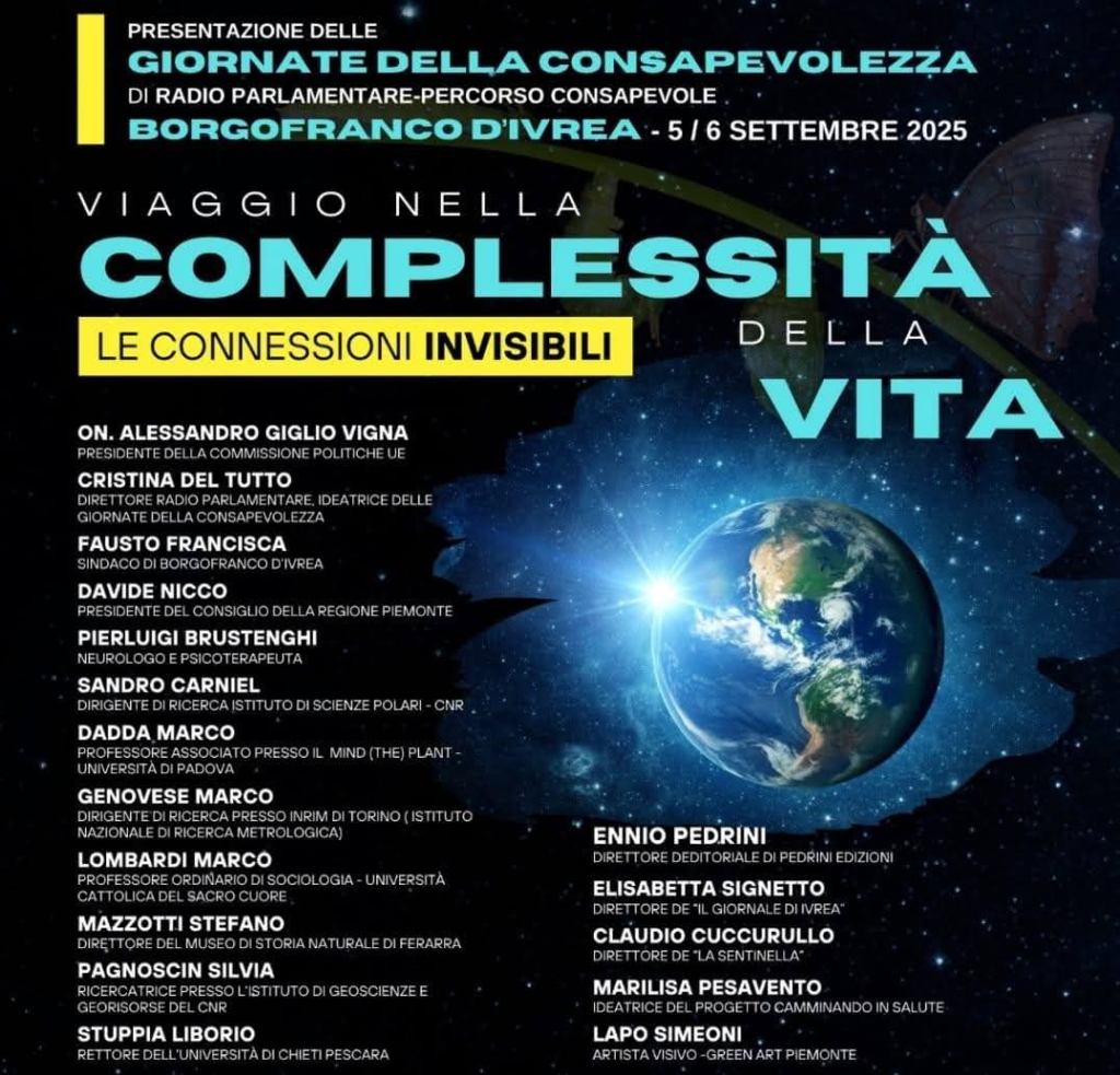Per la prima volta, il Canavese diventa protagonista di un evento nazionale che mette al centro la scienza, la cultura e il dialogo con il territorio. Arrivano infatti a Borgofranco d’Ivrea le Giornate della Consapevolezza, manifestazione scientifico-culturale di rilievo ideata da Cristina Del Tutto, CEO & Founder di Radio Parlamentare – Percorso Consapevole, e inaugurata nel 2024 al Teatro Parioli di Roma.
