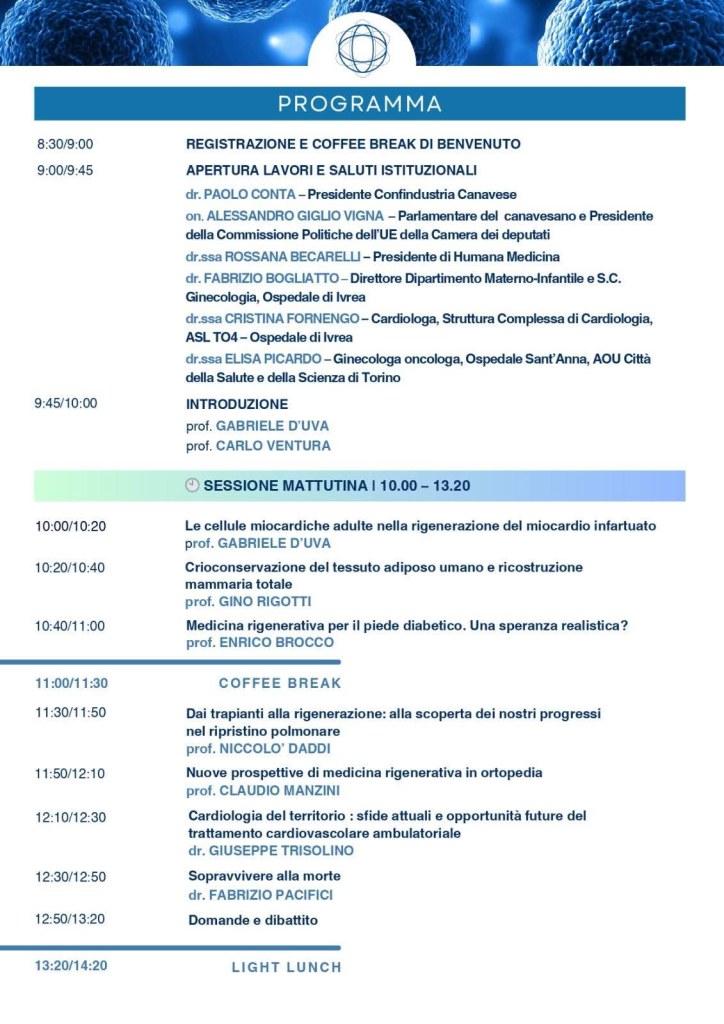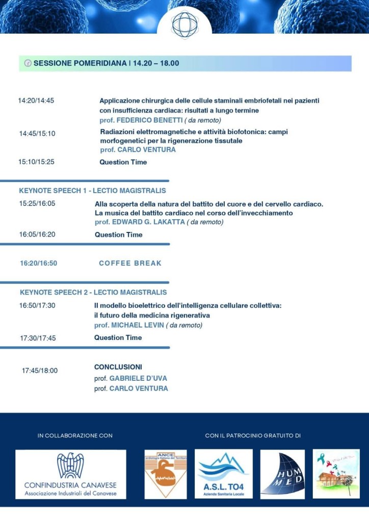 Il convegno, accreditato con 6 crediti ECM (Educazione Continua in Medicina), ospiterà relatori di rilievo nazionale e internazionale, ed è diretto dal Prof. Carlo Ventura, scienziato di fama mondiale nel settore della medicina rigenerativa.
